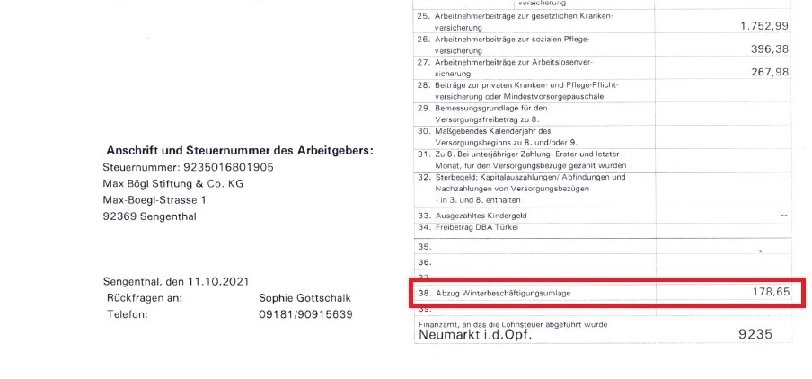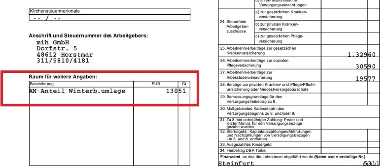 Příspěvky do Winterbeschäftigungsumlage, které platil zaměstnanec, lze uplatnit v německém daňovém přiznání k dani z příjmu jako daňový výdaj. Příspěvky zaměstnance jsou zpravidla výslovně uvedeny přímo v jeho německém ročním zúčtování – Lohnsteuerbescheinigung.